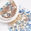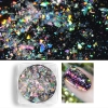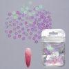 Блестки для нейл-арта делаются из пластика, бывают различного размера и форм. Продаются в баночке размером 39х16 мм. В ассортименте лавандовые, серебристые, фиолетовые, пудровые и другие тона блесток. В дизайне можно удачно комбинировать мелкие блестки с более крупными, сочетать разные цвета и создавать узоры. При этом покрывать можно как всю ногтевую пластину, так и лишь ее часть.