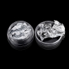 Нередко в дизайне маникюра используются специально измельченные для этих целей кусочки фольги. После покрытия ногтей гель-лаком, высушивания его и покрытия топом, кусочки фольги пинцетом выкладывают произвольно или в соответствии с определенным рисунком на ногти. Затем снова следует сушка в лампе, покрытие топом и опять сушка. Фольга продается в баночках размером 29.5х29.5х14.5 мм.
