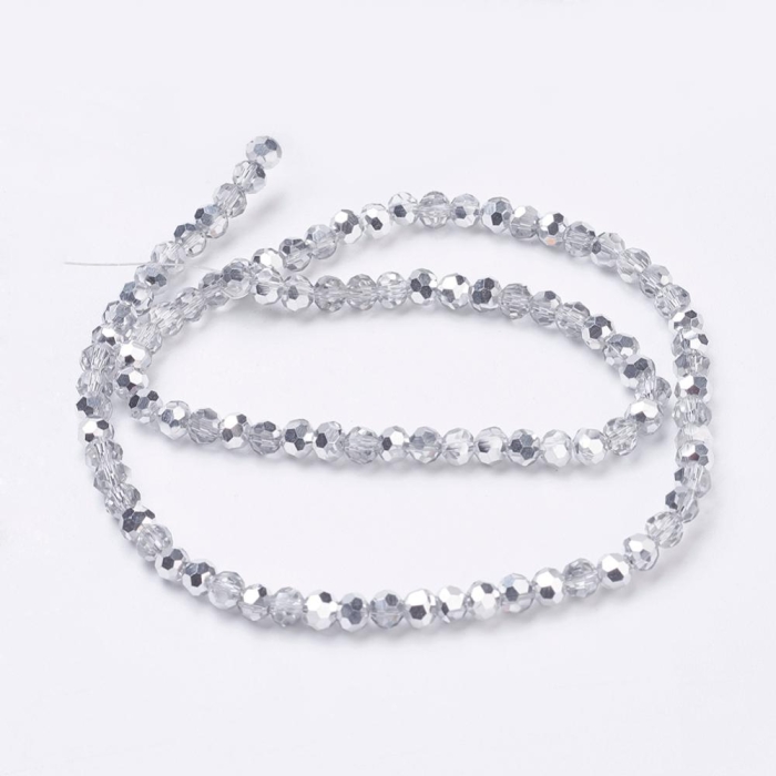 Качественные стеклянные бусины с гальваническим покрытием серебристого цвета. Классическая круглая форма и мелкая гранёная поверхность создают яркое, многогранное сияние. Размер 4 мм делает их универсальными для самых разных видов рукоделия и ювелирного творчества. Устойчивое гальваническое покрытие придаёт бусинам металлический блеск, который не тускнеет со временем при бережном использовании.