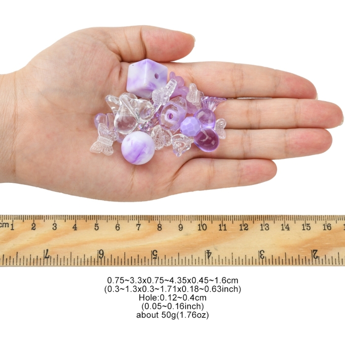 Набор декоративных акриловых бусин насыщенного цвета тёмной орхидеи — это отличный выбор для всех, кто увлекается творчеством и созданием украшений. В упаковке представлены бусины для рукоделия разных форм: как прозрачные, так и непрозрачные. Размеры варьируются от 7.5 до 43.5 мм, диаметр отверстий — от 1.2 до 4 мм, что делает их универсальными для работы с различными материалами.