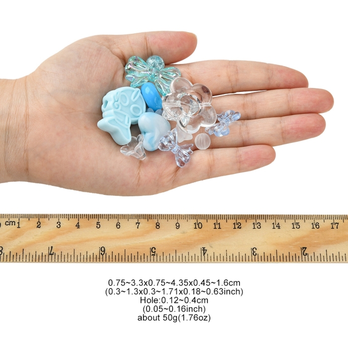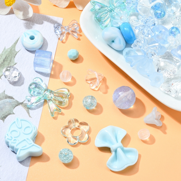 Набор декоративных акриловых бусин насыщенного светло-голубого цвета — это отличный выбор для всех, кто увлекается творчеством и созданием украшений. В упаковке представлены бусины для рукоделия разных форм: как прозрачные, так и непрозрачные. Размеры варьируются от 7.5 до 43.5 мм, диаметр отверстий — от 1.2 до 4 мм, что делает их универсальными для работы с различными материалами.