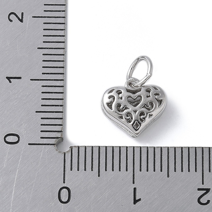 Изысканные объемные (3D) подвески-шармы в форме сердца с декоративным цветочным узором, выполненные из стерлингового серебра 925 пробы. Каждый шарм имеет родиевое покрытие (рhodium plated), которое придает ему благородный платиновый блеск и защищает от потемнения. Конструкция полая - шармы выглядят легкими и одновременно объемными. В комплекте - готовые к использованию открытые кольца (jump rings), а на поверхности есть четкий оттиск «925», что гарантирует настоящее серебро.