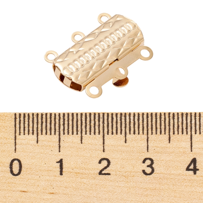 Надійні багаторядні застібки типу Box, виготовлені з нержавіючої сталі 304, із покриттям справжнім золотом 24К. Дизайн у формі прямокутника з декоративним квітковим візерунком, із 6 отворами (по 3 з кожного боку) для зручного з’єднання кількох рядів прикрас. Мають щільний замковий механізм, який забезпечує міцне кріплення.
