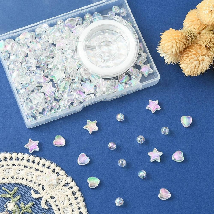 Набор включает разнообразные акриловые бусины с эффектом прозрачности и радужным переливом. В комплекте представлены бусины популярных форм — звёздочки, сердечки, круглые, — аккуратно рассортированные в удобном пластиковом боксе с дополнительной круглой секцией для хранения. Лёгкий и прочный материал делает бусины идеальными для детского и взрослого творчества.