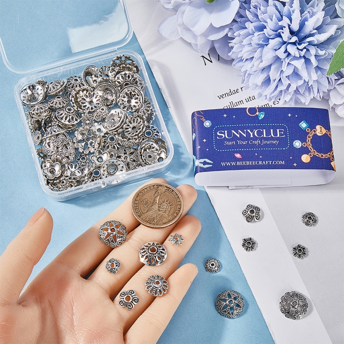 Набор шапочек для бусин в форме цветов, выполненных в винтажном тибетском стиле. Диаметр 8 мм, 8 различных дизайнов. Изготовлены из прочного бижутерного сплава с покрытием под серебро. Поставляются в удобной коробочке, 160 шт. в наборе.