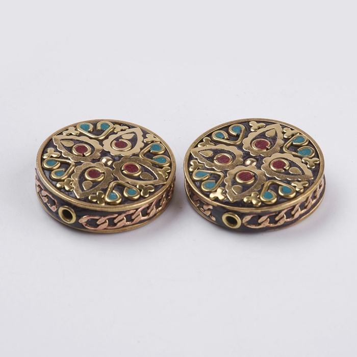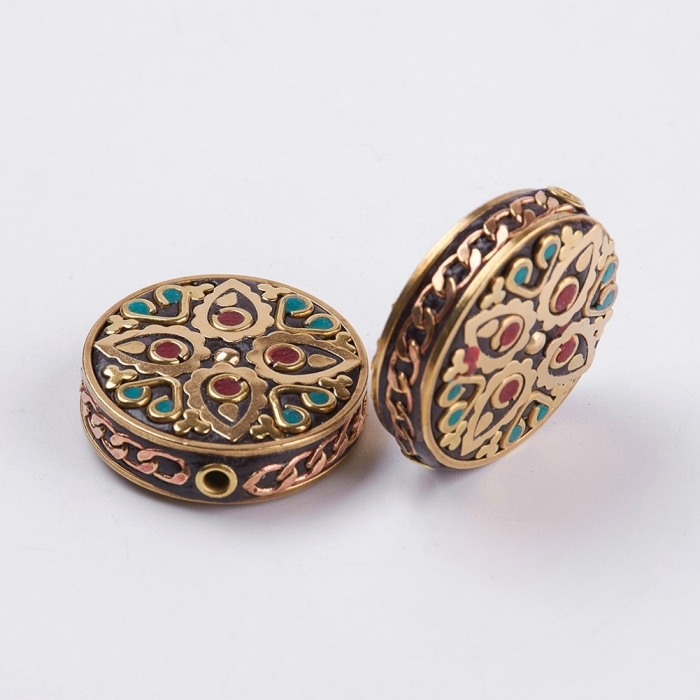 Бусины Индонезийские из Полимерной Глины и Латунной Фурнитуры, Круглые Плоские, без Никеля, Ручная Работа.