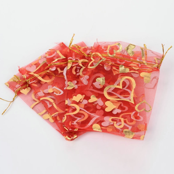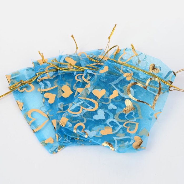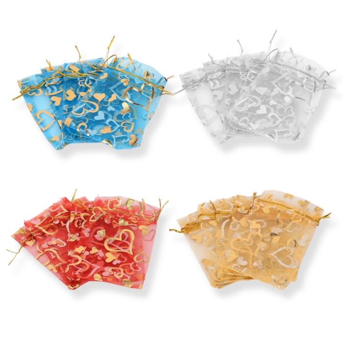 Набір Подарункові Мішечки з Органзи з Кулькою Прозорі з Рисунком Серце Колір: Золотий, Блакитний, Білий, Червоний