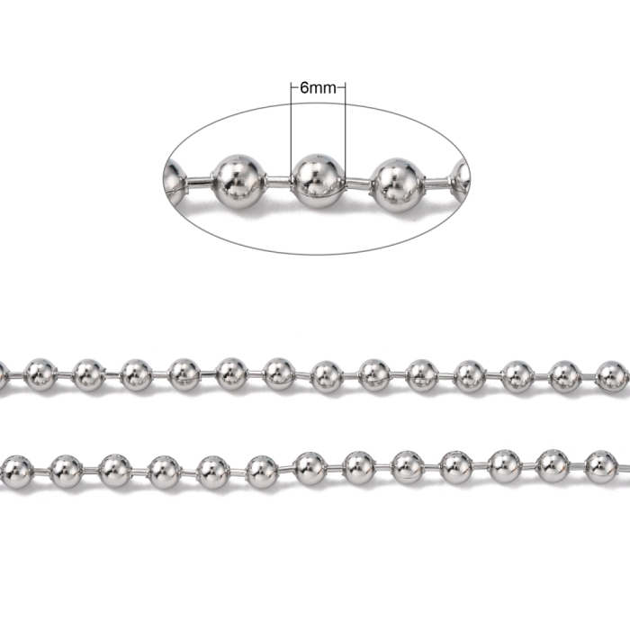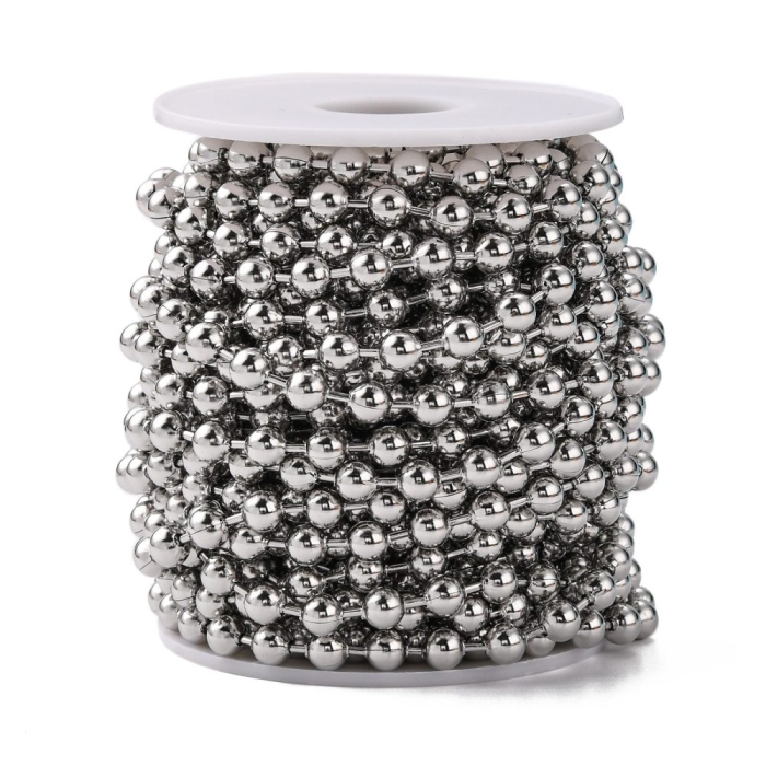 Міцний ланцюжок із плетінням "Перлина", виготовлений із високоякісної нержавіючої сталі, яка вирізняється стійкістю до потемніння, іржі та зношування. Має сріблястий сталевий колір і подається на зручній котушці, що полегшує зберігання та використання. Завдяки точній обробці кожна кулька має гладку, блискучу поверхню.
