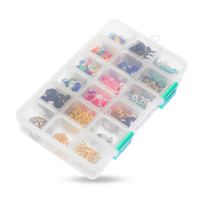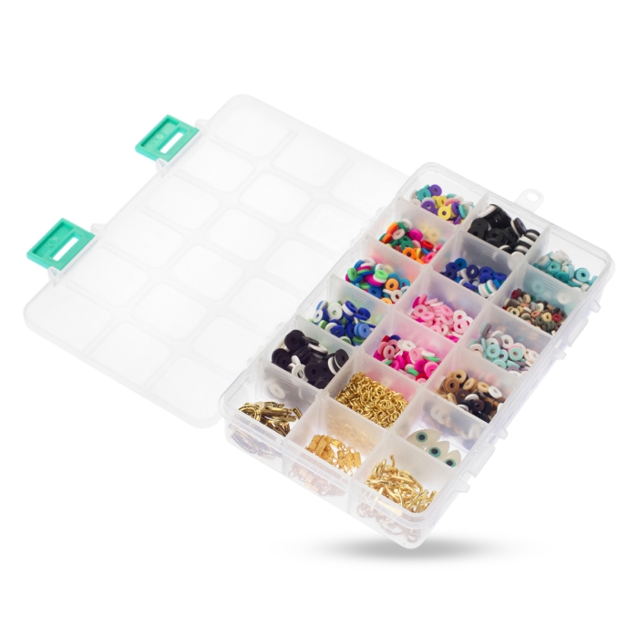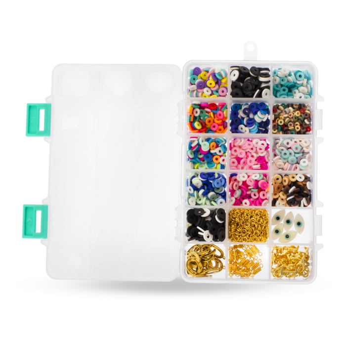 Практичний набір для створення прикрас у стилі Heishi, що поєднує різні матеріали – полімерну глину, метал та перламутр. У комплекті міститься близько 4670 елементів: плоскі намистини ручної роботи з полімерної глини, підвіски з перламутру, фурнітура у золотистому кольорі, еластична силіконова нитка та зручний пластиковий контейнер із 18 відділеннями.