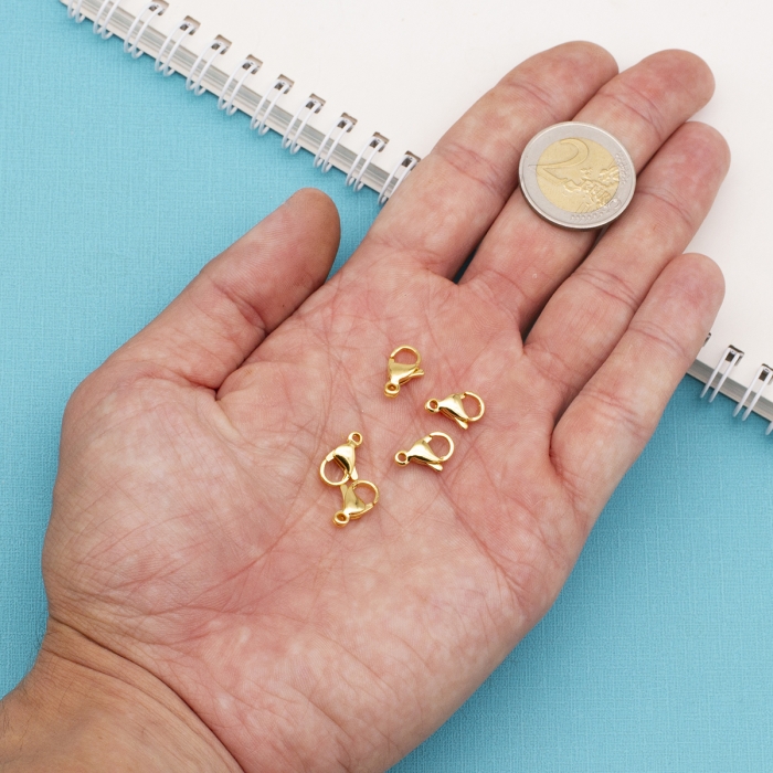 Застібка Карабін-Лобстер, Нержавіюча Сталь, Покриття Золото 24К, 13х8х4мм, Отвір 1.5мм, (УТ100029363)