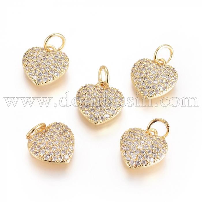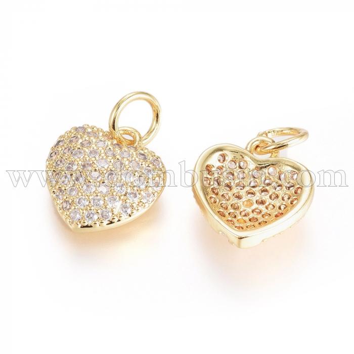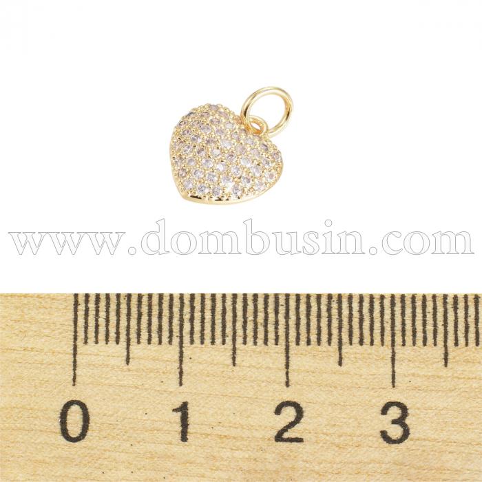Підвіска Серце, Латунь з Фіанітами, Покриття Золото 18К, Колір: Фіанітів Безбарвний, 10.5х10х2.5мм, Отвір 3мм, З'єднувальне кільце 5х0.7мм, (УТ100031307)